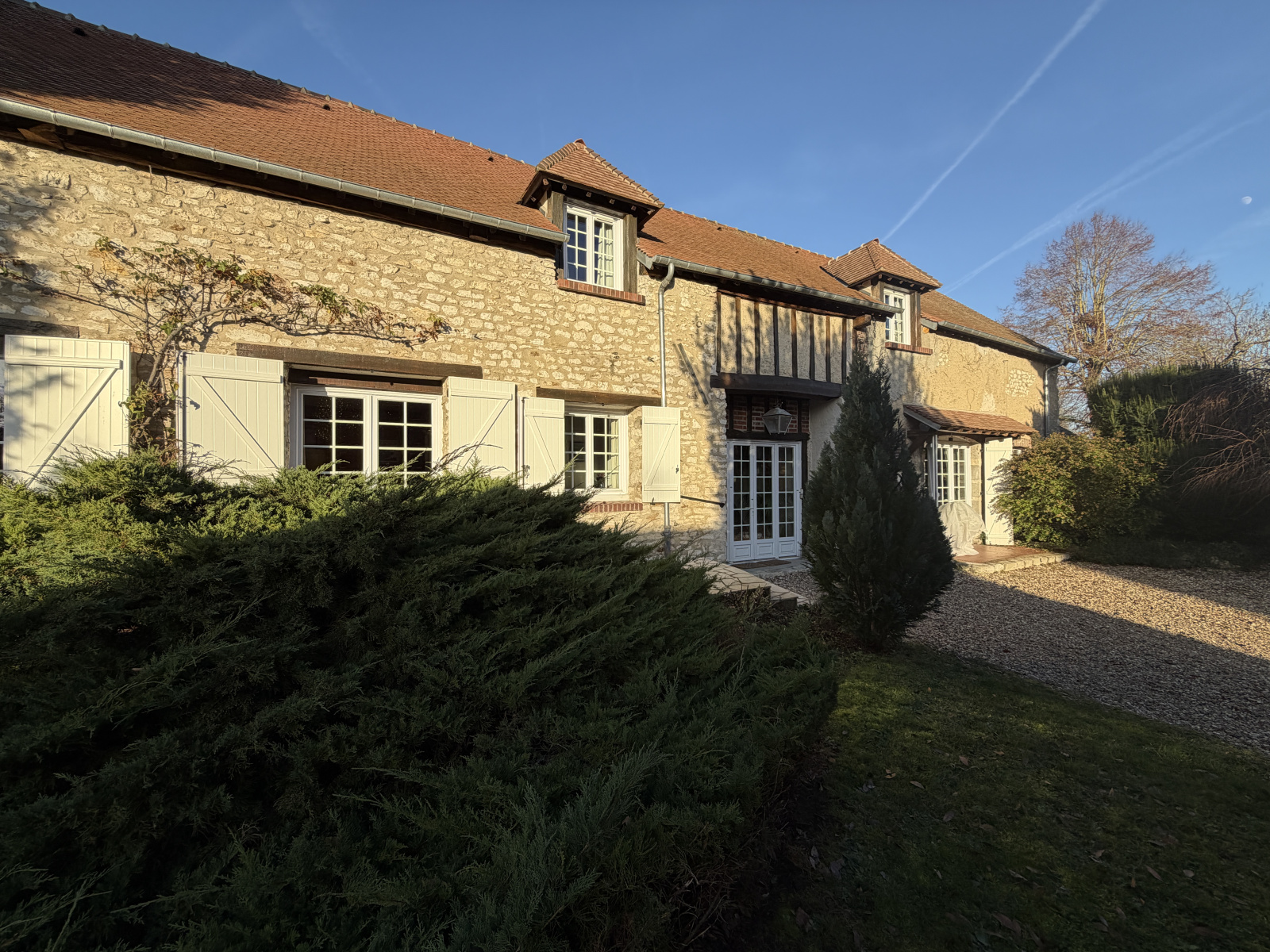 Magnifique extérieur , jardin clos et arboré sans vis-à-vis avec accès à la Vesgre, terrasse exposée Sud , carport 2 Véhicules , grange d'environ 65m² (garage , atelier ;, buanderie ), chaufferie