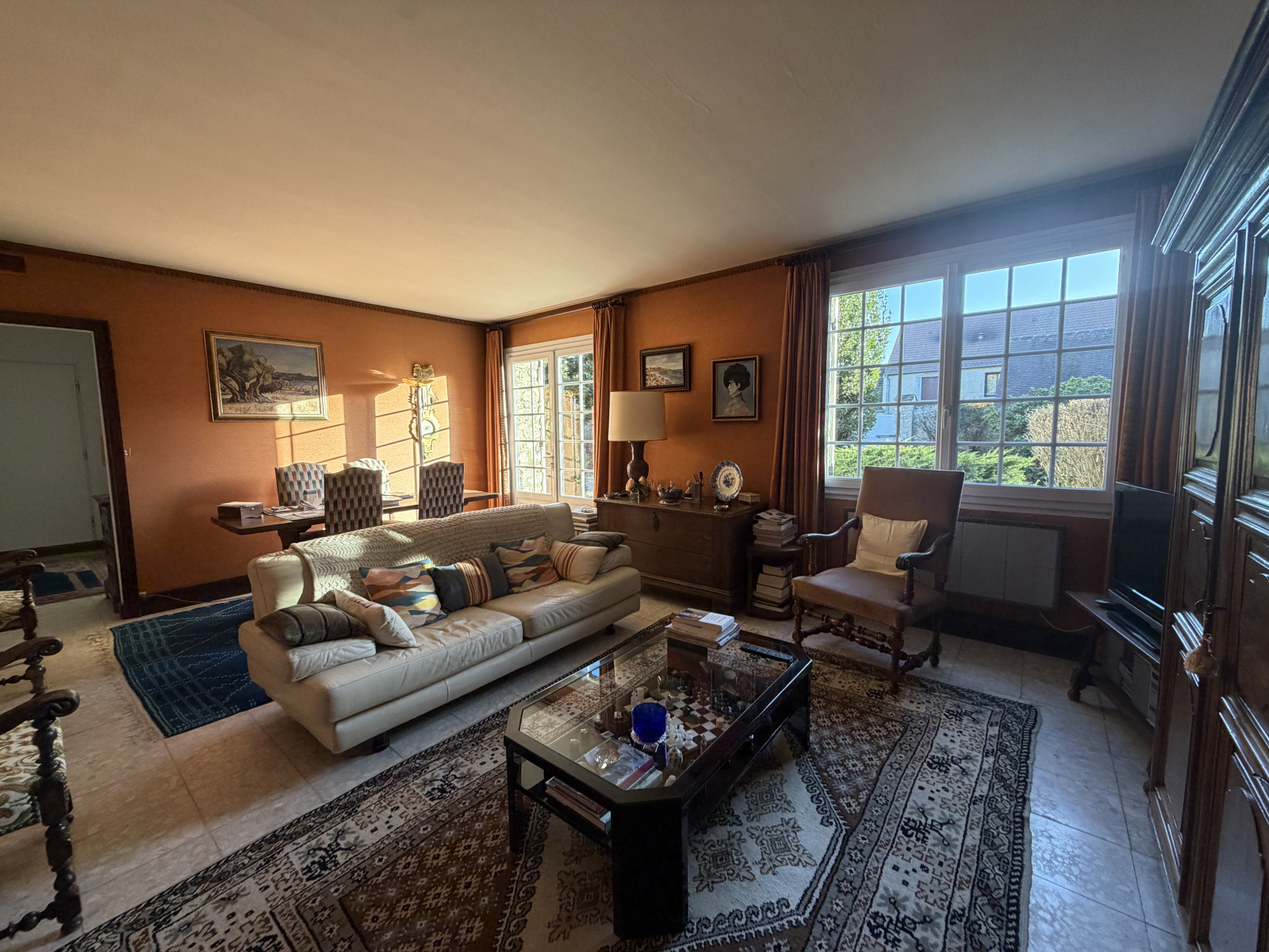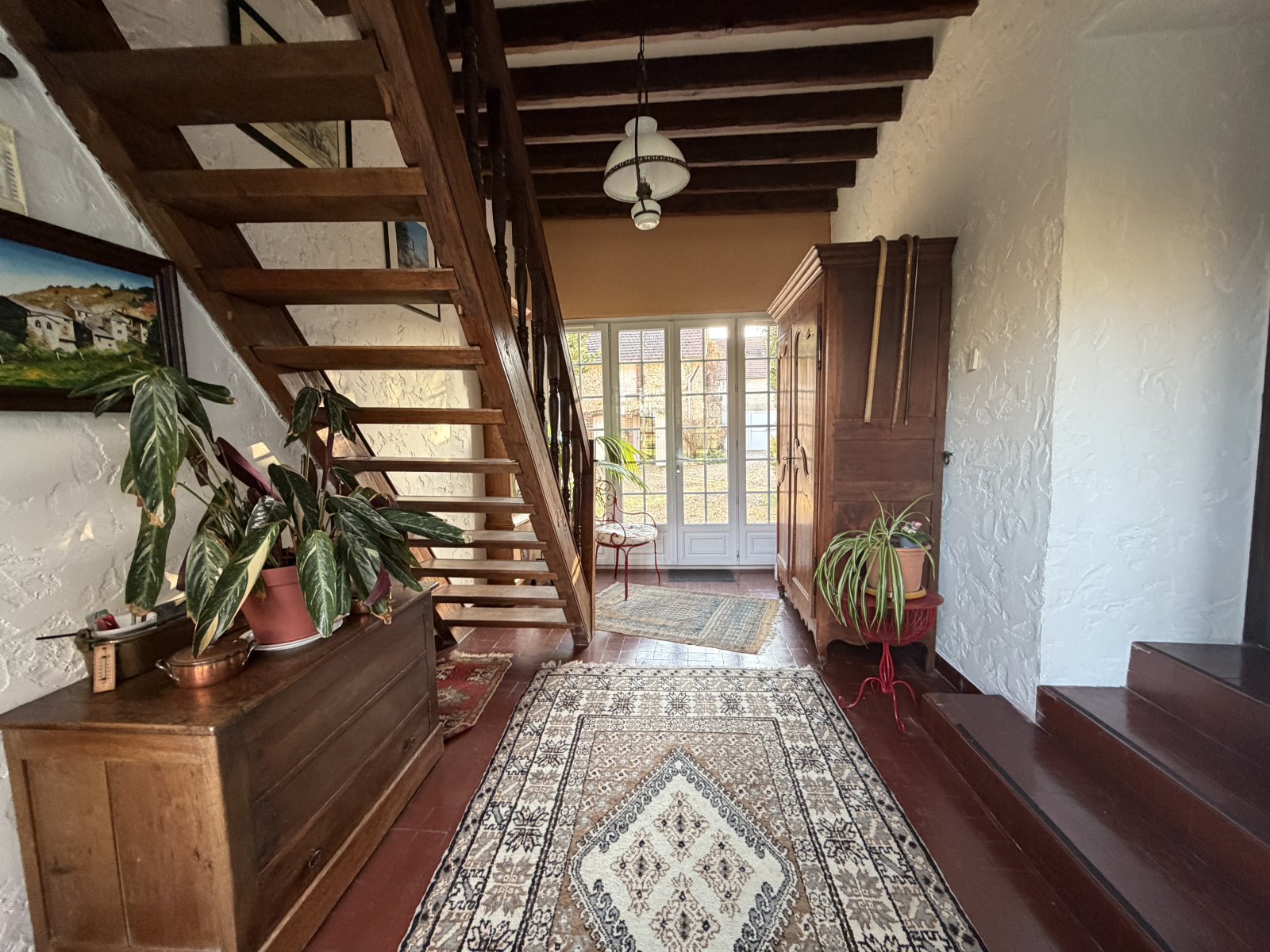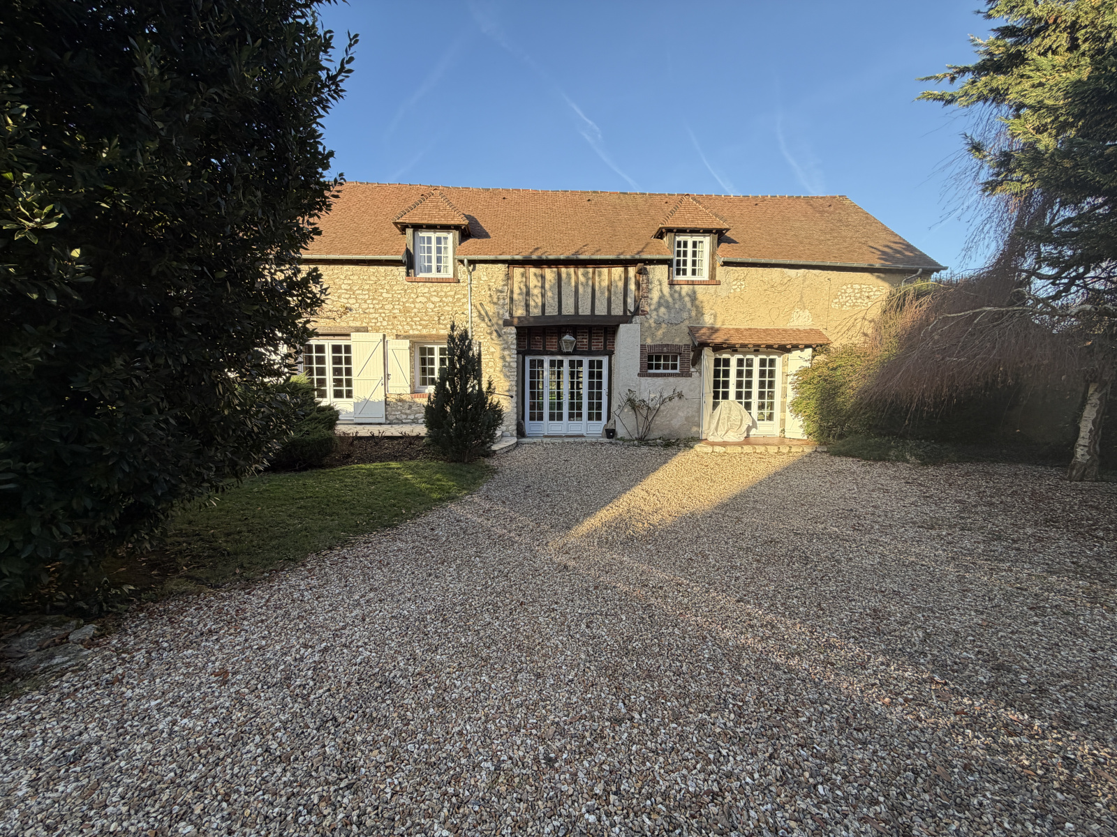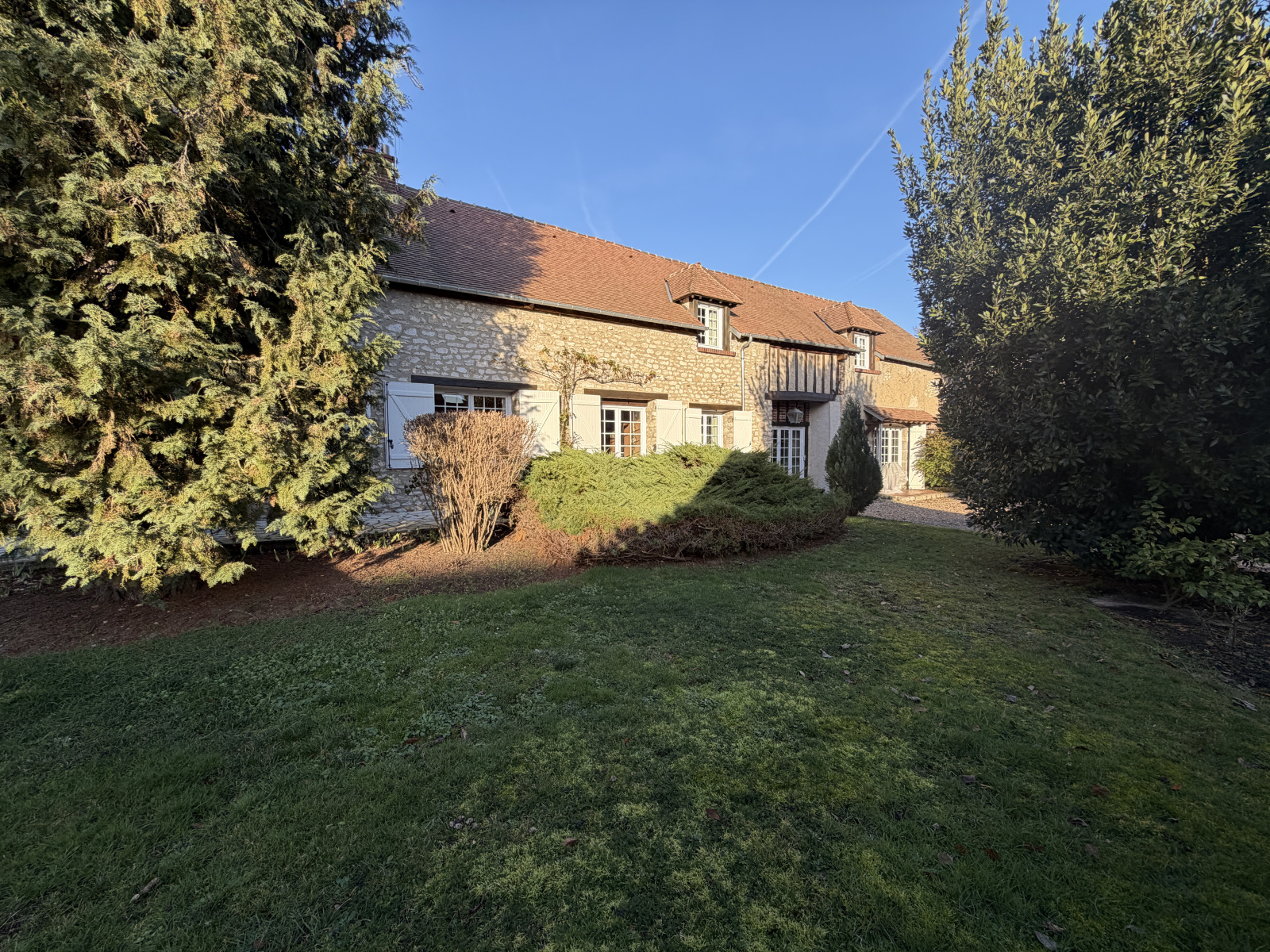 Magnifique extérieur , jardin clos et arboré sans vis-à-vis avec accès à la Vesgre, terrasse exposée Sud , carport 2 Véhicules , grange d'environ 65m² (garage , atelier ;, buanderie ), chaufferie